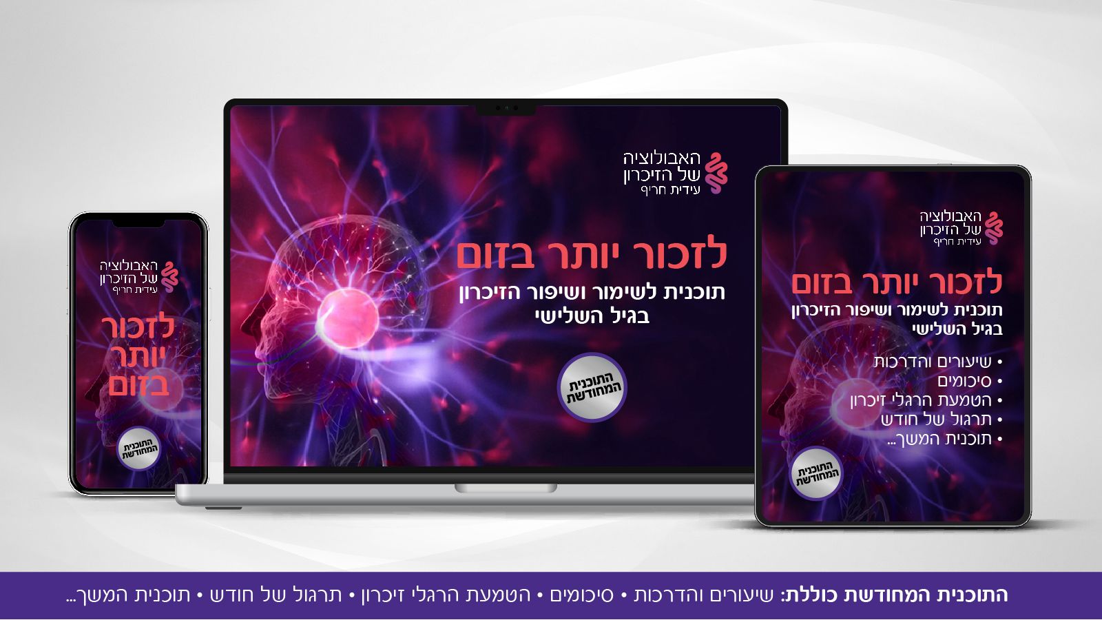 "הקורס "לזכור יותר" מקנה כלים שיטתיים לשימור ולשיפור הזיכרון. הקורס מקנה טכניקות לזכירת שמות, זכירת תוכן, זכירה יומיומית, כלים להתמודדות עם הקושי בשליפת מילים ועוד.